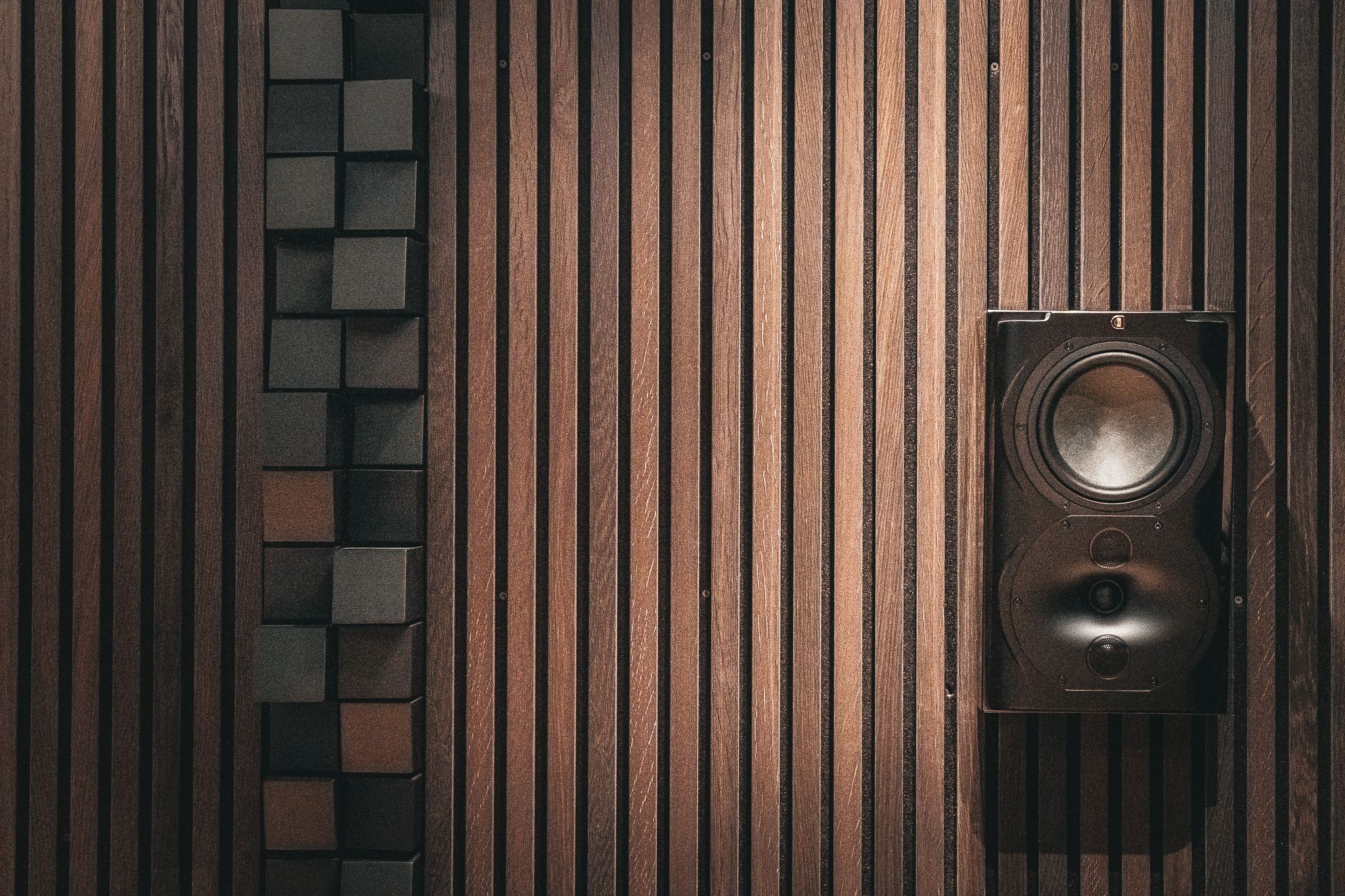 Huoneen akustiikka on tarkasti suunniteltu ja toteutettu laadukkailla materiaaleilla. Tilaan selkeän ja akustisesti suorituskykyisen perustan luovat tanskalaisen WoodUpp-valmistajan rimapaneelit, jotka määrittävät myös huoneen yleisilmeen. Mustat yksityiskohdat on toteutettu Vicousticin tyylikkäillä Multifuser Wood MKII -paneeleilla, joita voidaan asentaa useilla eri kuvioilla tilan ilmettä ja akustiikkaa hienosäätäen. Multifuser-paneeleita on saatavilla myös useilla eri viimeistelyvaihtoehdoilla.
